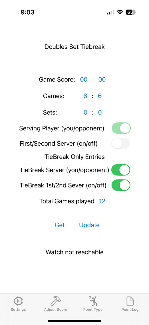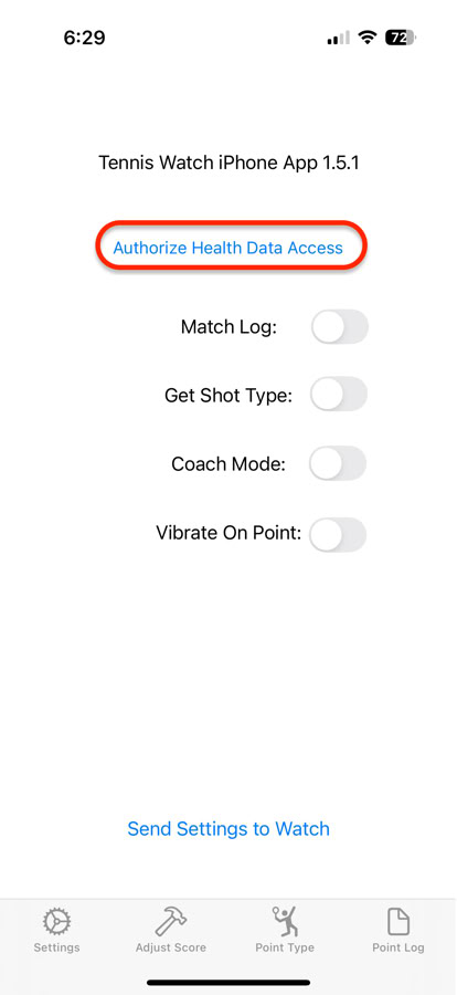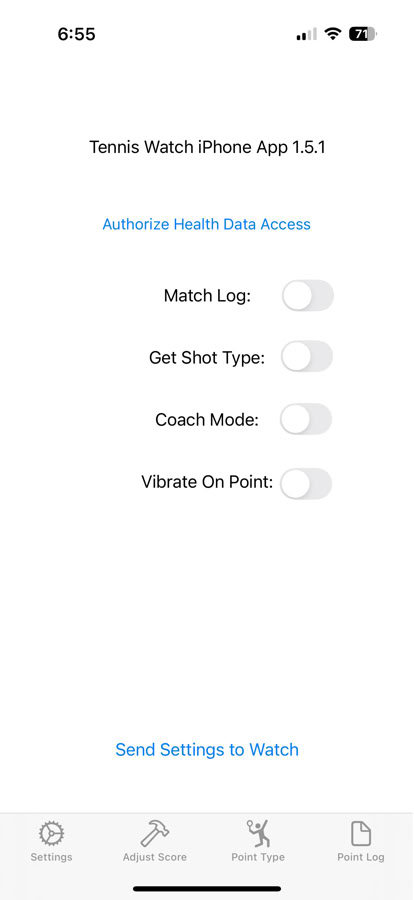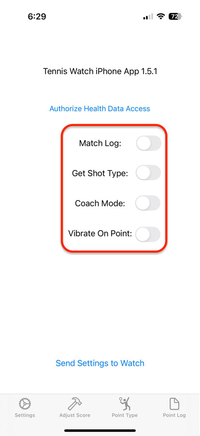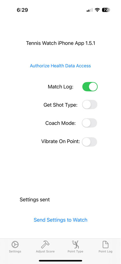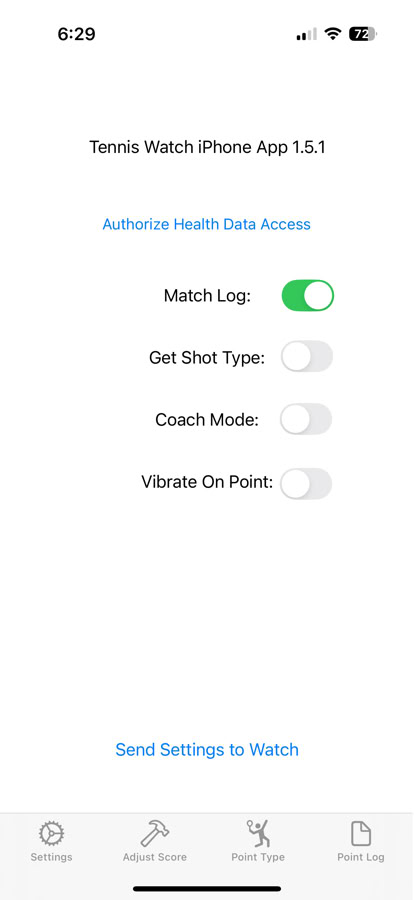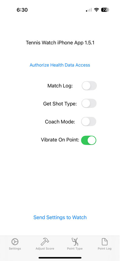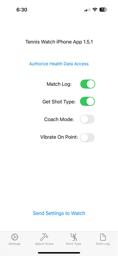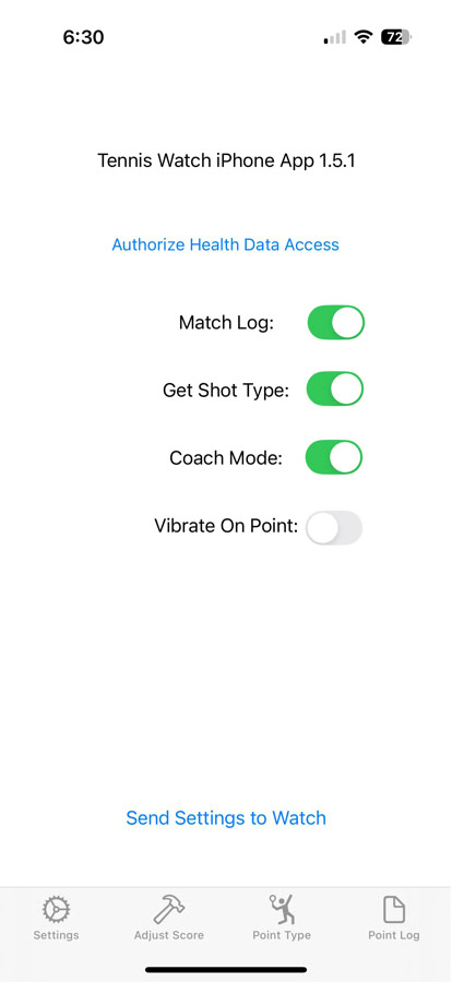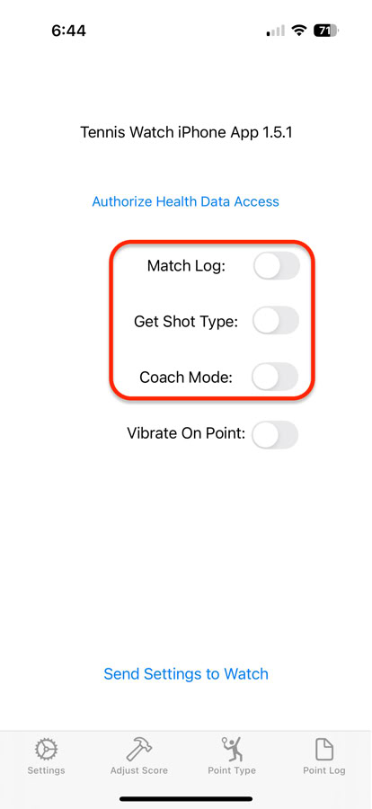 Transmit the settings to the watch by setting the ‘Match Log’ switch on in settings and then using the ‘Send Settings to Watch’ button to transmit the data. You can add more detail by turning on the ‘Get Point Type’ switch on before transmitting. There is also a ‘Coach Mode’ setting which allows someone handling the phone to make manual entries into the log as well as pick the point type as well, relieving the player of the task.