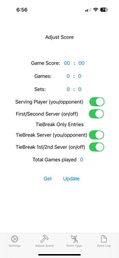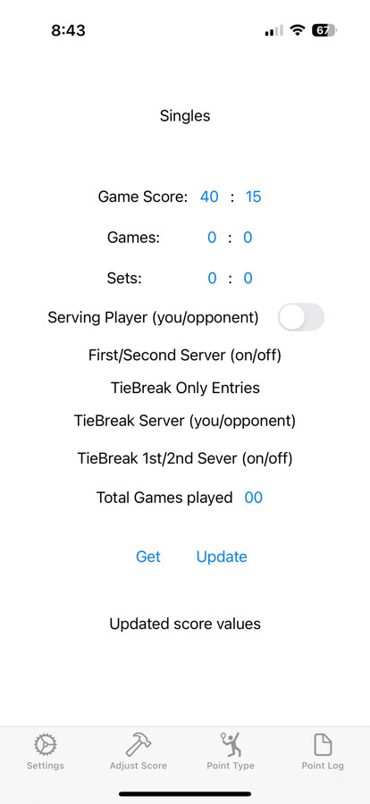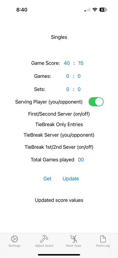 When the watch score gets out of whack for whatever reason and needs to be adjusted, use this phone screen to update the watch scores. The process is same for doubles as it is for singles with the exception of how to specify the server. For now, let’s just step through the process for singles and review the process for doubles later.