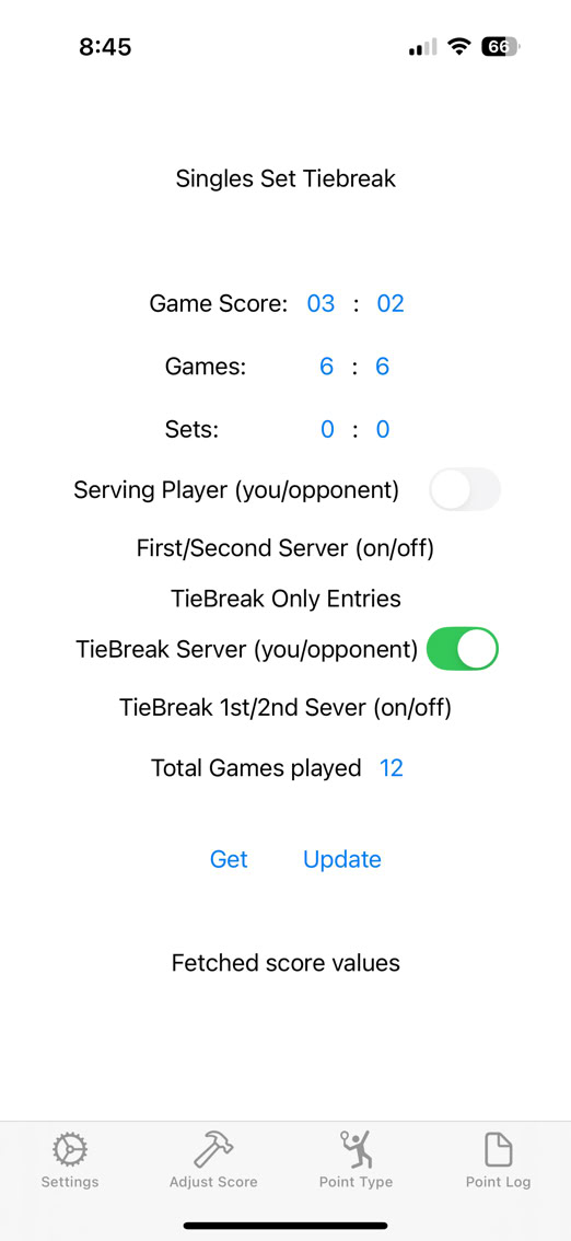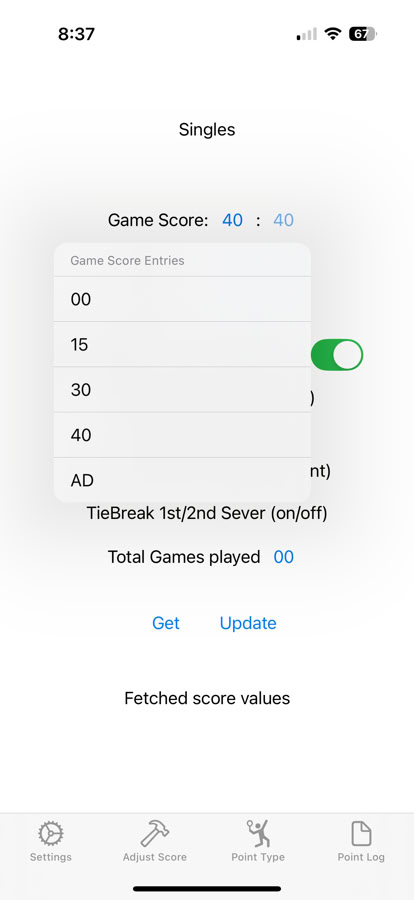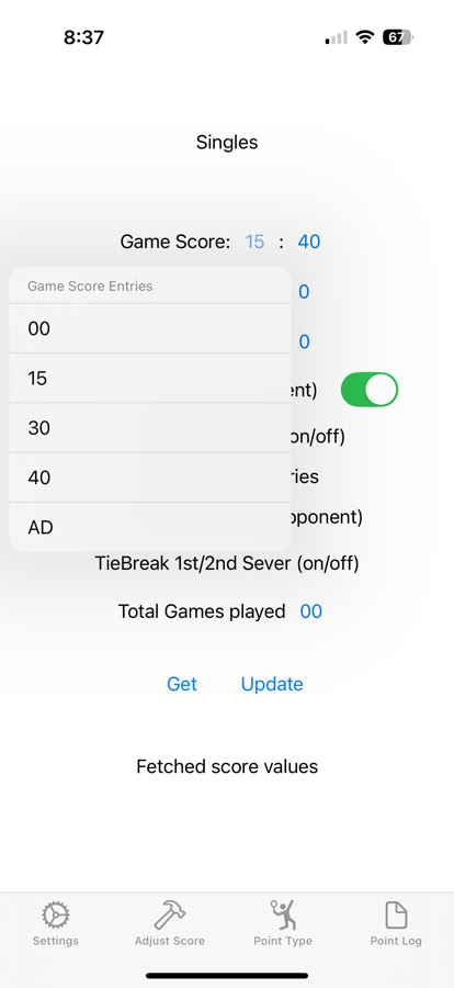Suddenly, you realize that you’ve been entering the score backwards and it’s really 40-15 and you need to fix it. Tap on the ‘Adjust Score’ tab button and then press the ‘Get’ blue button. In order for the fetch to work, the app on the watch needs to be active and be showing on the screen. You know the fetch worked when the watch vibrates and the phone screen shows the score. A successful fetch message also displays: