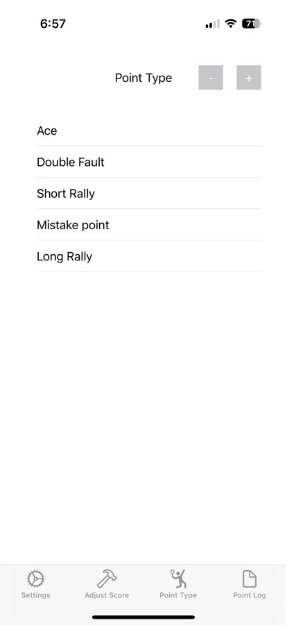 For this first example, we’ll do a point log with point type selection turned off. The following screens show the logging of a series of points during the course of the first game of a match. As each point is scored on the watch, it transmit the result plus the current score to the phone to be entered into the Point Log record: