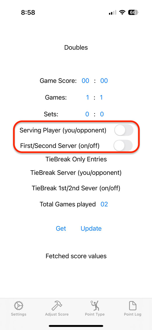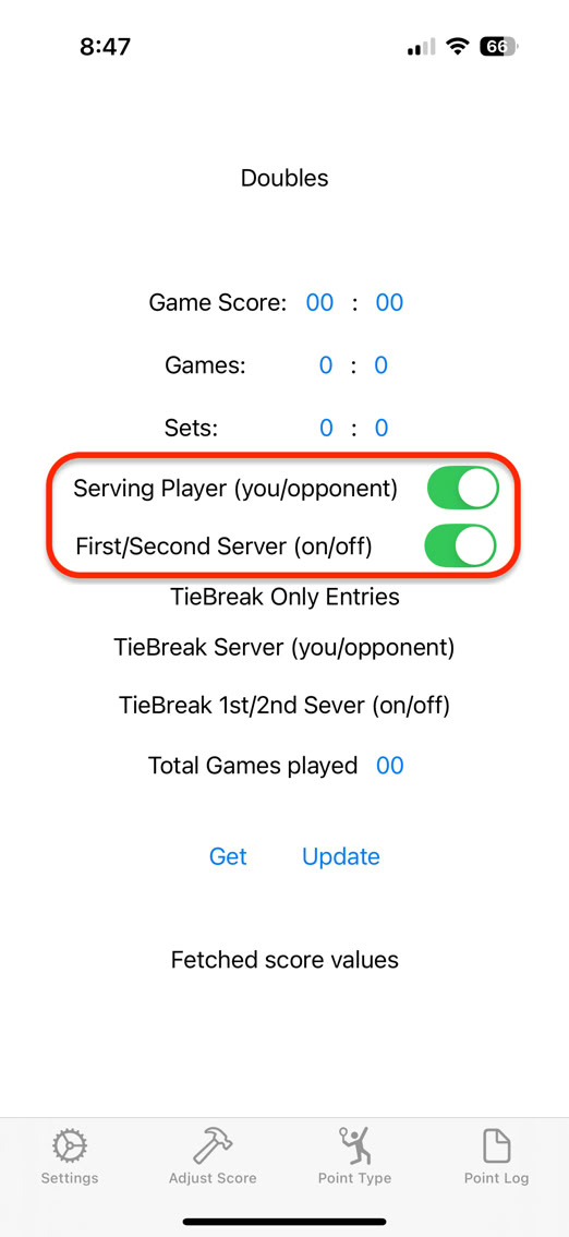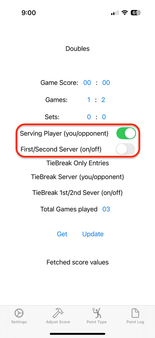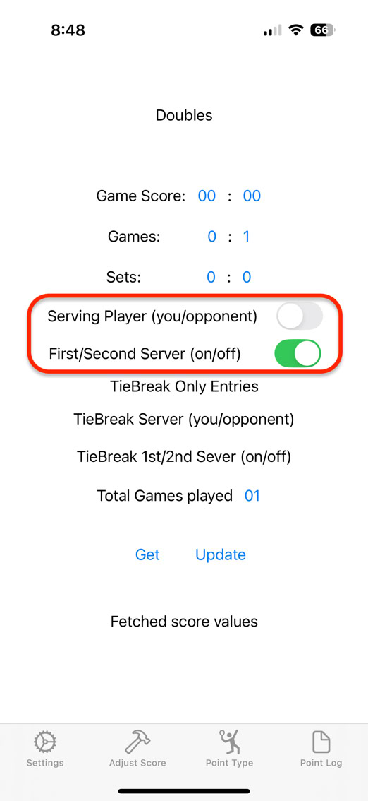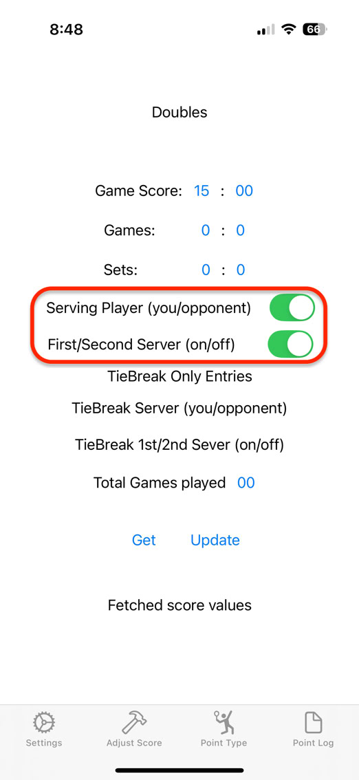 The server button has been expanded into two buttons now. There’s one for which team is serving (you or your opponents) and a separate one for indicating if the first server is serving or the second server is serving. In singles during regular play, those buttons do not appear. Only the serving player button is active: