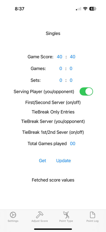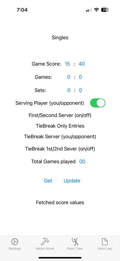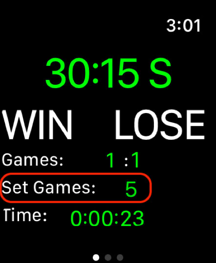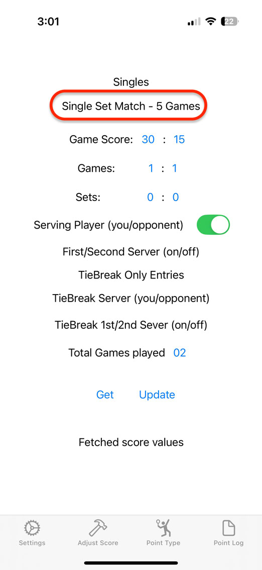 Things work the same when adjusting a single set match. The only real difference is that after you fetch the watch game state, the phone screen does indicate that you are playing a single set match and lists the number of games in the set.