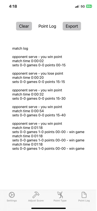 Match log will enable the watch app to start setting point by point updates to the phone as a record of what happened during the match current match. This complete match record can help in diagnosing what happened during a match and help diagnose poor or good play.