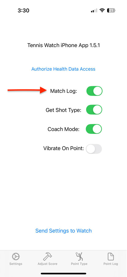 The first step to starting match logging is to make the proper settings on the phone and then transmit them to the watch. For simple match logging it starts with setting the logging switch on in the settings tab and transmitting that data to the watch.