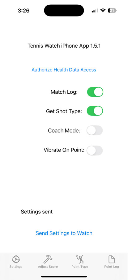 Once you have the Point Types the way you want it, you need to transmit that information down to the watch app. Go to the settings page and set the switches like this and then press the ‘Send settings to Watch’ button to send them across. Also the watch will vibrate when it receives the data.