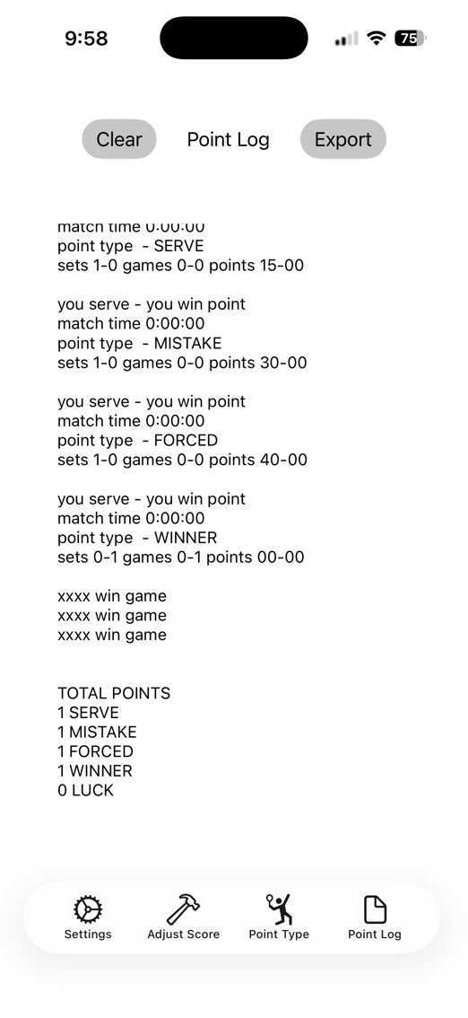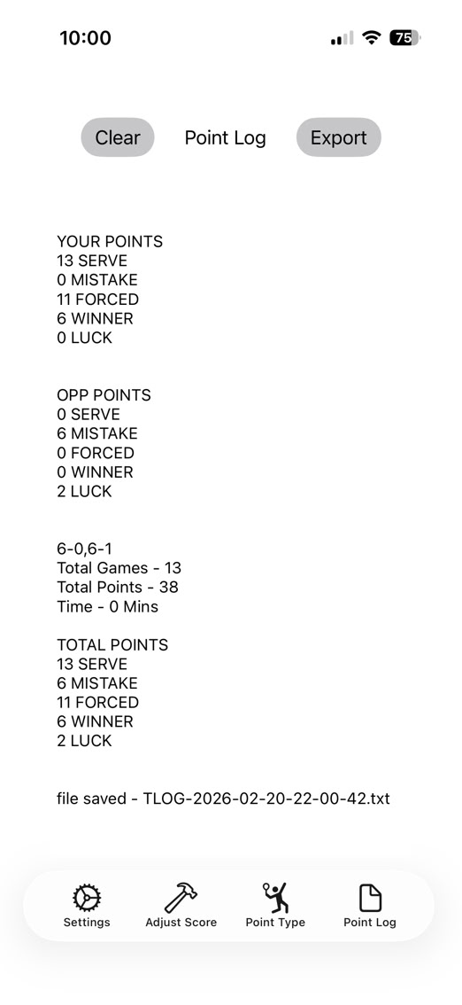 The watch part of this works just as it does now with no changes but the logging now shows totals. At the end of each game, an accounting of the points is displayed. At the end of the set and match, three sets of totals are displayed. One as a total, one credited to you, and a third credited to your opponent. Here are some examples: