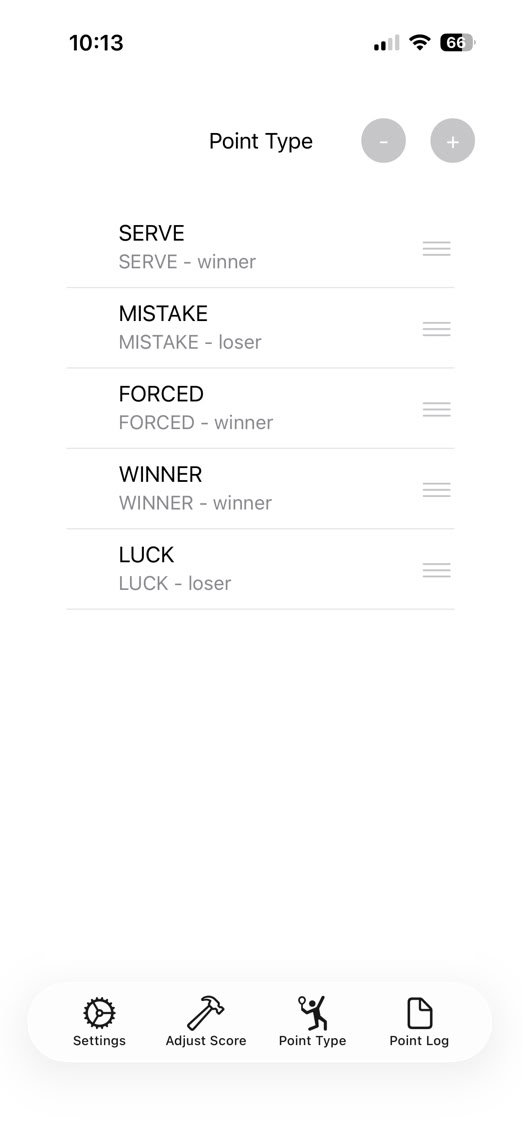 This is how this setting is used. As you can see below, SERVE, FORCED, WINNER, and LUCK will be credited to the stats of the winner of the point. So if you serve and win the point (ace or mishit back), it will be credited to your stats as a SERVE point. If you lose that point, it is credited to your opponent. If you are receiving and the point goes the other way and you assign it as a SERVE type point win, it credits your opponents totals.